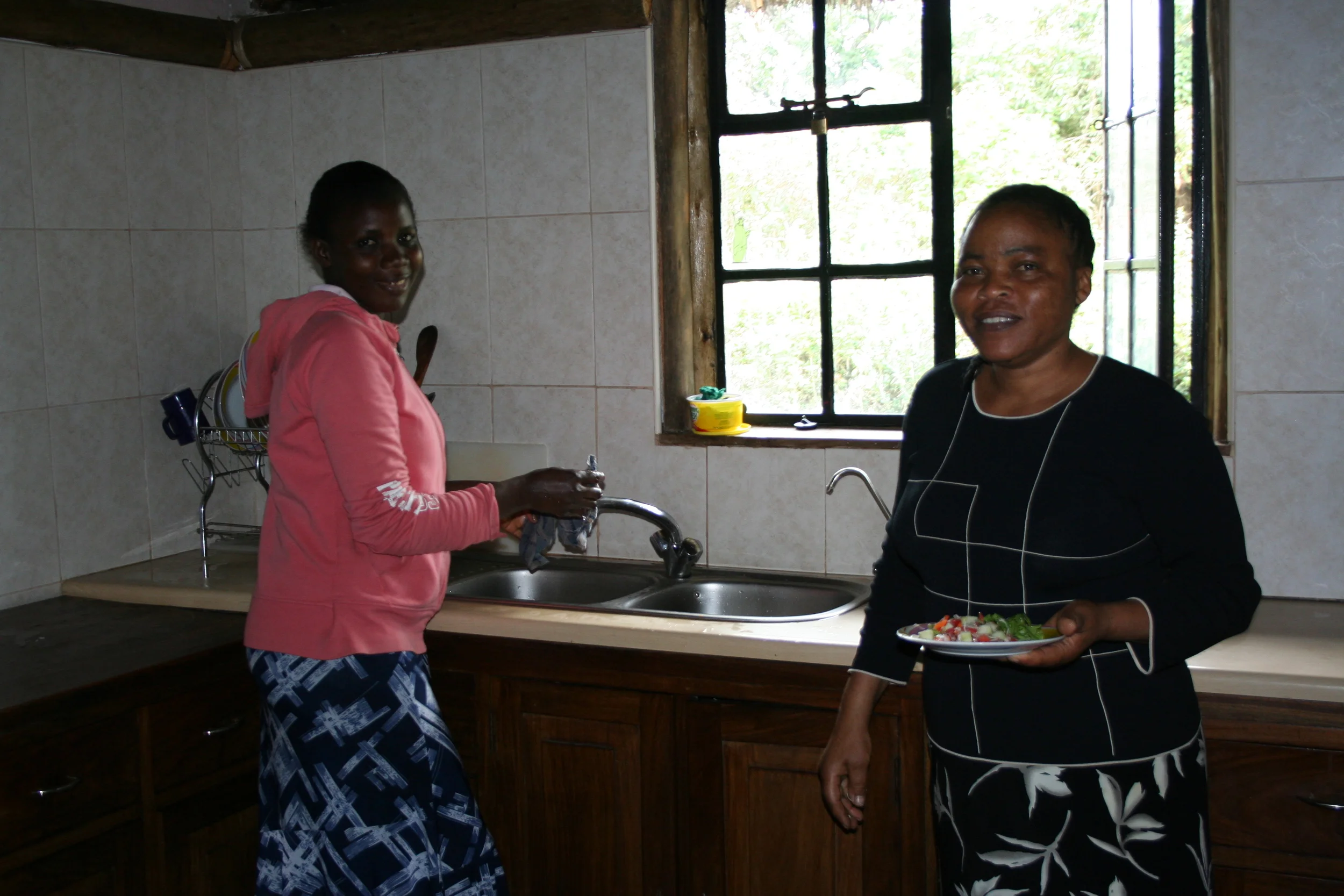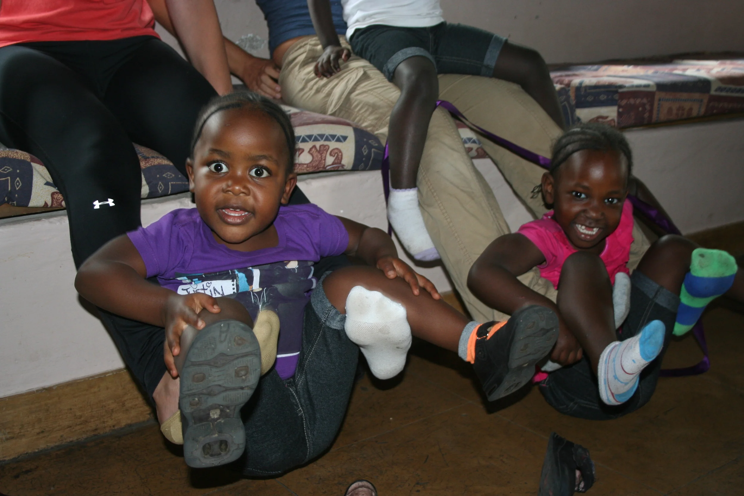 We gathered up all our supplies and headed to the main house to have a nice lunch made by Mama Josephine, the house mom. When we walked in all the girls were eating and staring at us again, it was really funny. So we gave them hello hugs and they went back to eating. Happy had food stored in her mouth like a little chipmunk, it was really cute. When we all finished our meals we played with the girls. They really are warmed up to us now, especially baby Dori. After sitting and having the girls do flips in our laps and jumps on us, we decided to do leg lifts with the girls sitting on our legs. Let’s just say some can do leg lifts better than others.